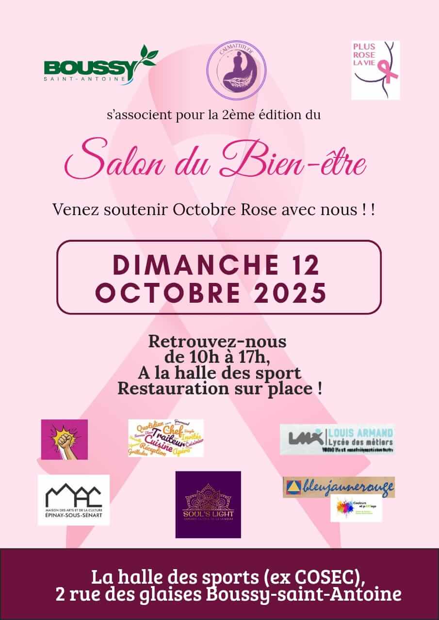 Cette année, le Service Vie locale de Boussy-Saint-Antoine collabore avec l’association Calmattitude afin d’organiser de nouveau le salon Bien-être à Boussy-Saint-Antoine dans le cadre d’Octobre Rose, le 12 octobre prochain. À cette occasion, les participants sont invités à se vêtir de rose pour une marche de sensibilisation au dépistage du cancer du sein et à venir découvrir les exposants, conférences, ateliers de groupe et praticiens présents sur le salon.